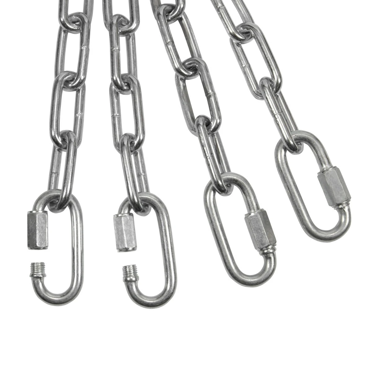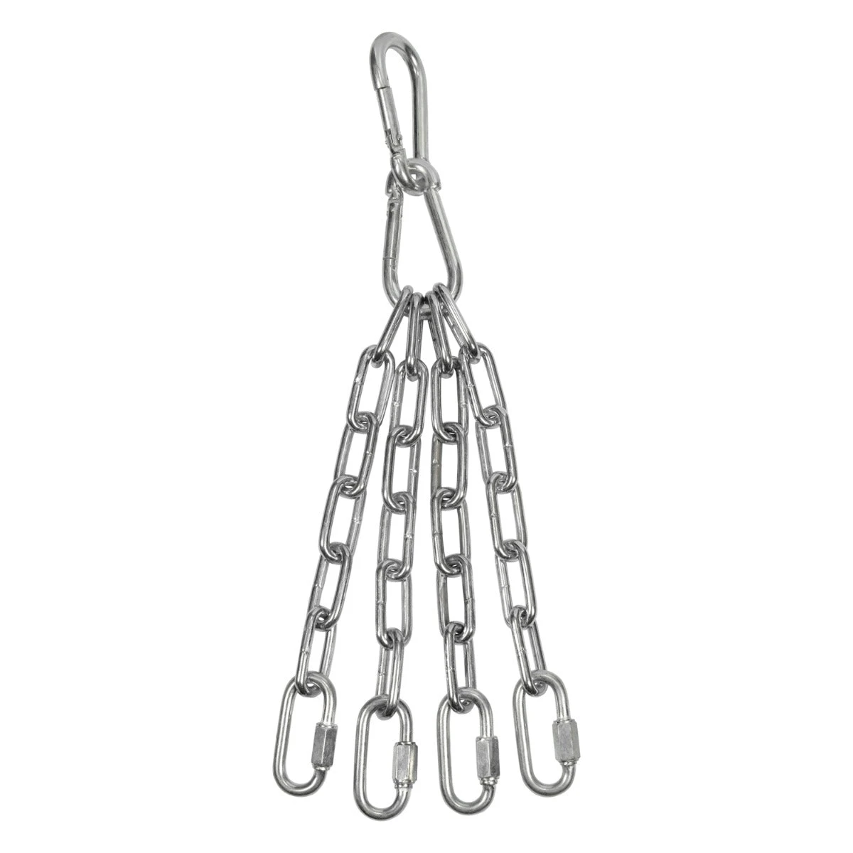 Galvanized steel chain set includes 2 carabiners, 6 chain links, 1 quick link. Ideal for heavy bags up to 100lbs. 18” in length.